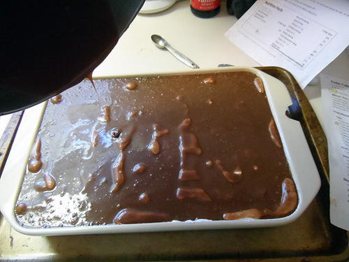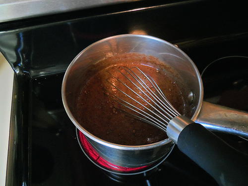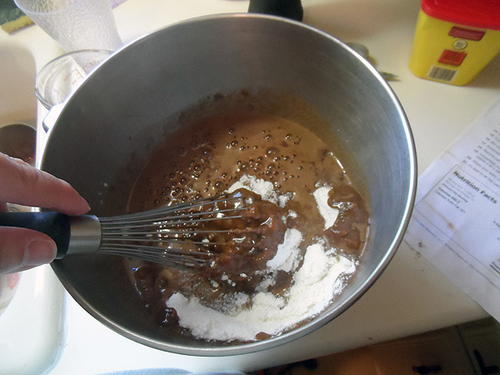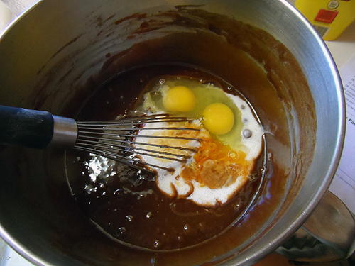 Pour the warm chocolate mixture over the flour mixture and whisk until thoroughly combined.