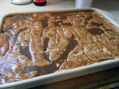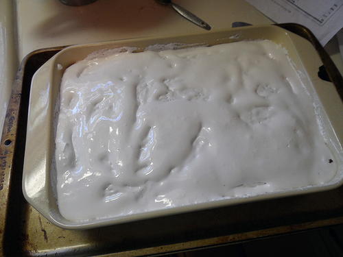 Remove cake from oven and immediately drop dollops of marshmallow cream onto the top of the hot cake. Allow it to sit for a minute or so. Carefully spread the marshmallow cream across the top of the cake. Slowly drizzle the warm chocolate frosting over marshmallow layer. Allow cake to cool completely before serving. Tastes even better the next day!