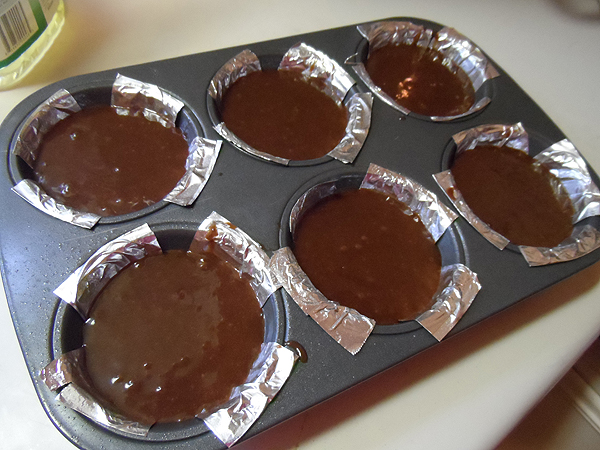 - Prepare brownie batter as described on the back of the box or according to your favorite recipe. (1 box of prepared brownie mix measures out to about 2.5 cups batter). Distribute batter evenly among muffin tin cups. Muffin cups will be about 3/4 full.