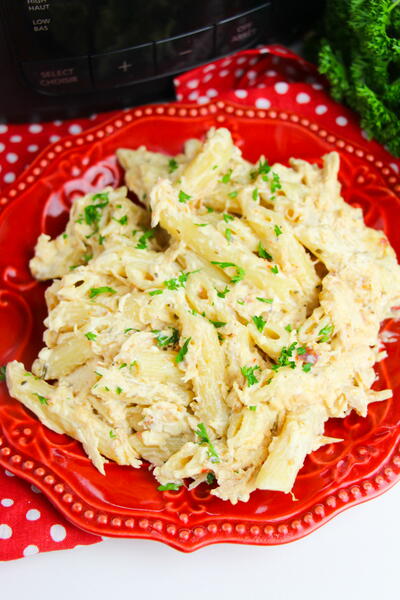 "Dinner is a breeze with this creamy and zesty slow cooker recipe for copycat Olive Garden chicken pasta. Just 5 ingredients that you set it and forget it! Get a restaurant quality pasta recipe right at home! To make the recipe you will need: boneless skinless chicken breasts Italian seasoning Olive Garden Italian Dressing a block of cream cheese Parmesan cheese A box of pasta salt and black pepper In the slow cooker add: chicken, Italian seasoning, salt and pepper. Pour in the Italian Dressing, then top with cream cheese and Parmesan cheese. Cook for 4 hours on high. Cook the pasta, shred the chicken and serve!"