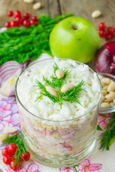 "Gentle puff salad «Snow Queen» will pleasantly surprise you with an unusual combination of tastes. Ham, crab sticks and processed cheese are its parts. Sweet-sour apple makes salad juicier, and fried kernels of peanut give a pungent flavor to a dish. One of advantages you can call the fact that the recipe doesn’t demand a long preparatory phase for boiling ingredients. It is enough to cut all products and to lay them out in a certain sequence. For serving it is possible to use wide glasses, ice-cream bowls or soup bowls."