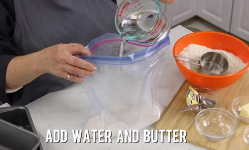 Add water and butter to the bag and seal the top. Knead the ingredients with your hands until the butter is well incorporated.