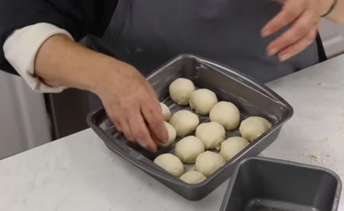 For dinner rolls: Spray two 8 x 8 bake pans with cooking spray. Divide the dough into two portions. Loosely roll each portion into a 2-inch wide log and divide that into 12 equal size pieces. Roll each piece in your palms to form a smooth ball, pinching edges underneath. Place in the pan and repeat with the remaining dough.